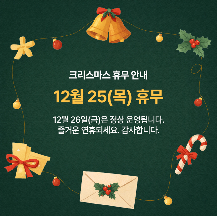 2025년 12월 25일(목) 크리스마스  2026년 01월 01일(목) 신정 휴무 안내 드립니다.